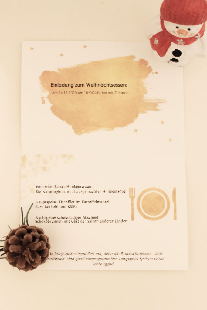 Diese Karte habe ich nur für diesen Blogbeitrag gestaltet. Ich veranstalte dieses Jahr kein Weihnachtsessen, aber eine schöne Idee wäre es allemal. So oder so ähnlich, hätte ich das ganze dann gestaltet. Das ganze ist etwas von Promidinner inspiriert.